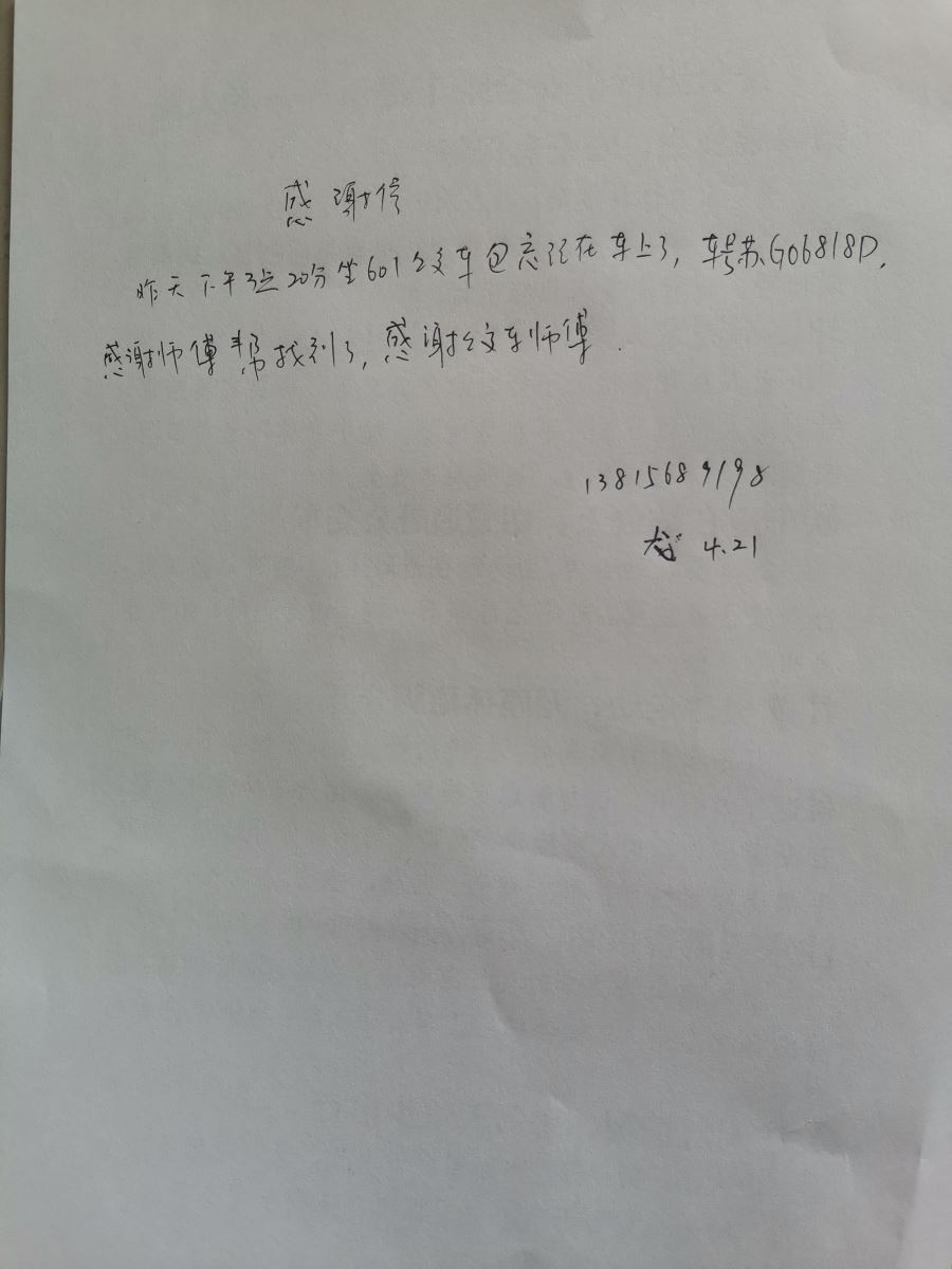 沒過多久,失主尤女士來到了大港路停車場調(diào)度室領(lǐng)取了自己丟失的包及手機(jī),她當(dāng)場寫下感謝信,對李傳新師傅表示萬分感謝。