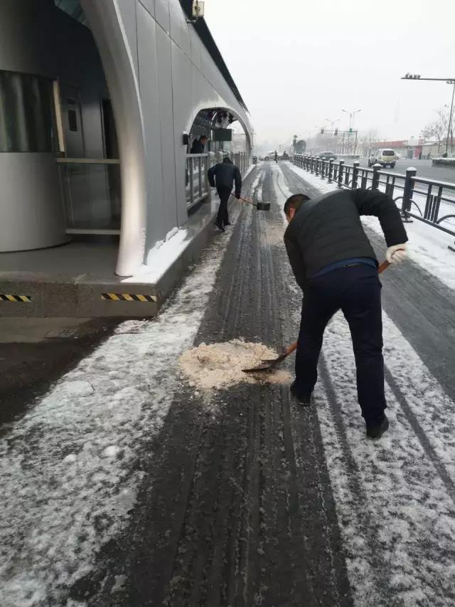 早上六點,BRT公司應急隊員協(xié)助站務員通過撒防滑鹽、清除積雪,做好BRT站臺防滑防凍工作,確保市民順利出行。明茂新能源公司及時啟動雨雪冰凍應急預案,對充電站設施設備進行全面檢查,對充電工絕緣手套、絕緣鞋穿戴情況進行檢查,要求充電工及駕駛員嚴格執(zhí)行充電安全操作規(guī)程。