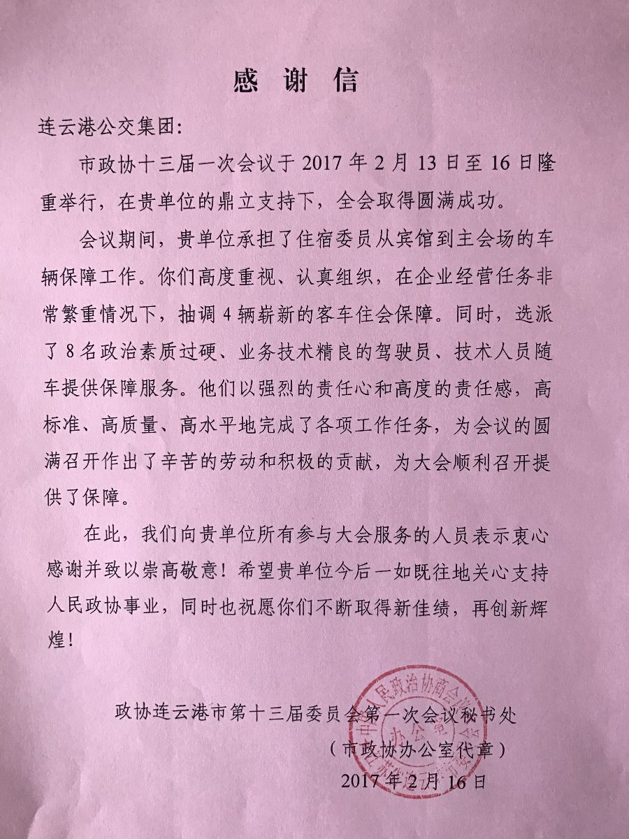 2月20日,市政協秘書長劉玉君、副秘書長張孝昌等相關人員來到公交集團,對公交集團圓滿完成兩會期間交通運輸保障工作給予了充分肯定,并向辛苦付出的駕駛員和工作人員致以感謝和慰問,并致以感謝信。