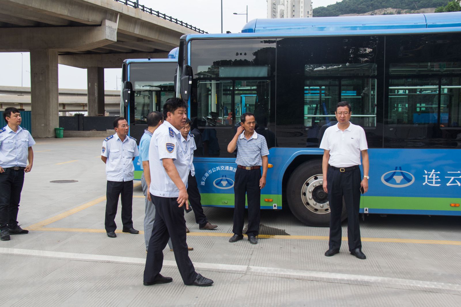 為確保按時間節(jié)點保質(zhì)保量全面完成年度重點工作任務(wù), 8月8日,交通控股集團投資部部長黃慶生、公交集團黨委書記、總經(jīng)理劉佃華,黨委副書記、紀委書記袁軍,副總經(jīng)理羅軍及相關(guān)部室負責人一行到徐圩新區(qū)、江化北路停保場調(diào)研場站及充電站建設(shè)相關(guān)工作。