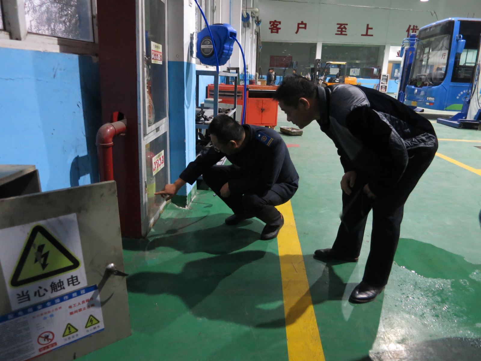 檢查過(guò)程中,由公交集團(tuán)機(jī)務(wù)技術(shù)部部長(zhǎng)、公交集團(tuán)汽服公司經(jīng)理趙玉軍帶領(lǐng)相關(guān)人員,對(duì)公司車間的消防器材、舉升機(jī)、用電、用氣情況進(jìn)行檢查,對(duì)檢查出來(lái)的安全隱患要求負(fù)責(zé)人現(xiàn)場(chǎng)解決,不能現(xiàn)場(chǎng)解決的安全隱患記錄在冊(cè),限時(shí)解決并擇期復(fù)查,趙玉軍詢問了修理工的作業(yè)進(jìn)度,并對(duì)他們進(jìn)行安全交代,要求他們嚴(yán)格遵守操作規(guī)程,做好安全防范工作。