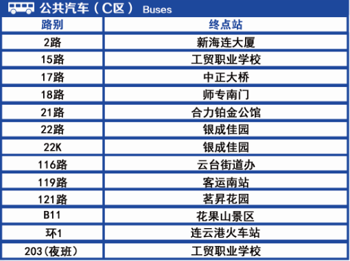 西城公交總站、連云港火車站、汽車總站、市一院通灌院區(qū) 、步行東街、蘇欣快客站、客運(yùn)南站、南城路口、板浦西山、華豐紡織、板浦中學(xué)(初中部)、板浦醋廠、銀成佳園