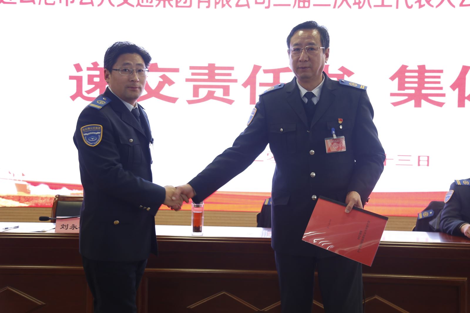 市交通控股集團黨委書記、董事長劉永能代表交通控股集團向大會的勝利召開表示熱烈的祝賀,他對劉佃華作的工作報告給予了肯定,同時指出公共交通服務業(yè)是交控集團重要的產(chǎn)業(yè)板塊,是衡量城市文明和諧的重要指標。多年來,公交集團積極貫徹落實市委市政府戰(zhàn)略部署和交控集團“十三五”規(guī)劃目標,致力于“暢通、安全、便捷、經(jīng)濟、綠色”的公共出行,全體員工團結(jié)一心,努力拼搏,無論從企業(yè)規(guī)模提量、管理水平、精神文明建設都實現(xiàn)了質(zhì)的突破,受到社會各界的廣泛關(guān)注和充分肯定,22萬人次的日客流量,25%的出行分擔率,96%的乘客滿意率,充分顯示了公交真正融入了百姓生活,成為了城市和諧發(fā)展不可或缺的部分。他要求,公交集團在取得成績的同時,也要清醒的認識到面臨的矛盾和問題,并針對公交集團2019年的工作提出三點意見:一是冷靜研判形勢,堅定發(fā)展信心。二是不斷探索創(chuàng)新,增強發(fā)展后勁。三是堅持優(yōu)化管理,強化發(fā)展保障。同時要求各位與會代表要帶頭認真學習貫徹本次大會精神,切實把各項工作落實到位。