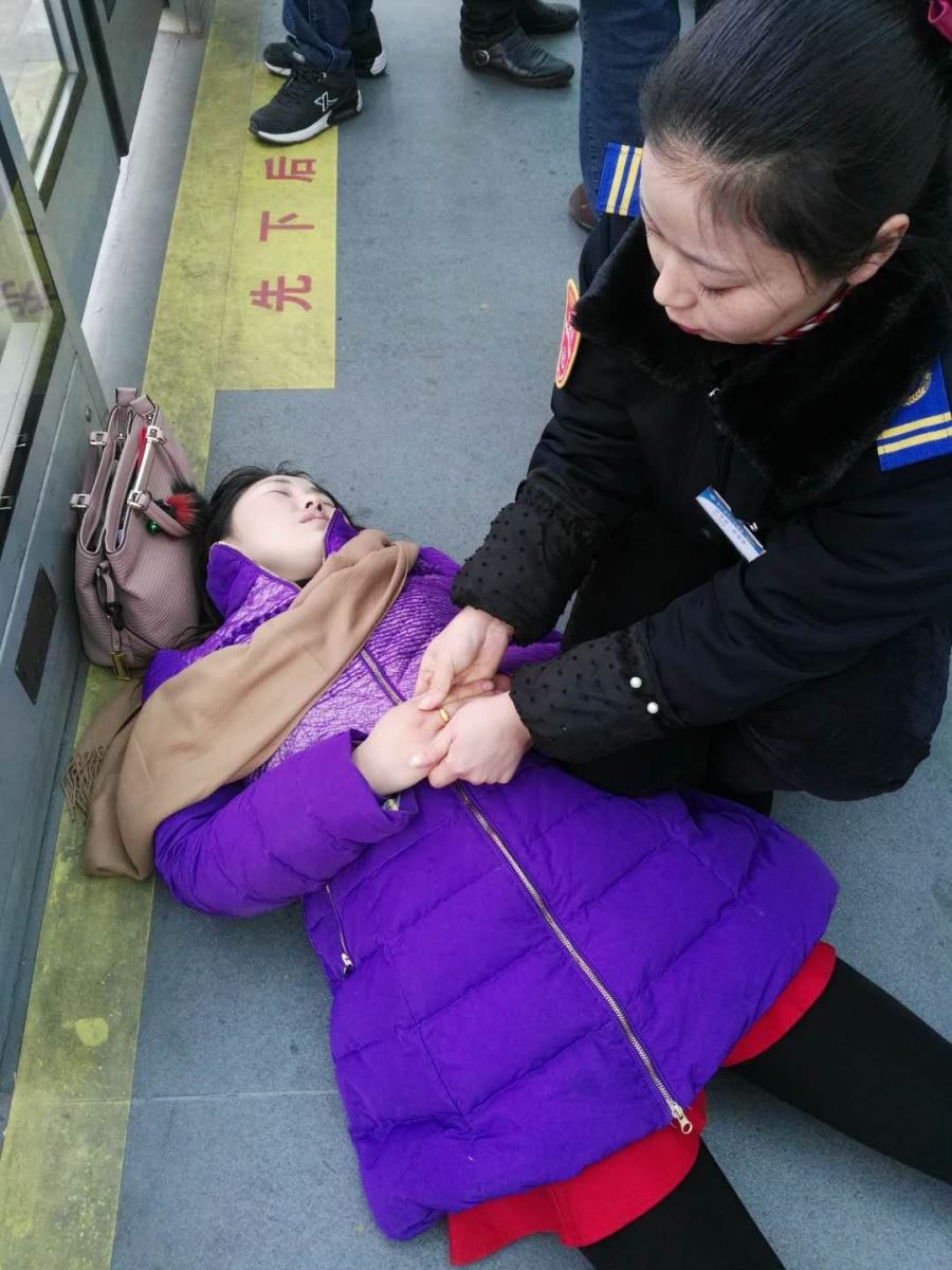 2018年1月26日下午16:15分,購物中心站內(nèi)發(fā)生了驚心動魄的一幕:一名中年女子在站臺內(nèi)等車時,突然暈倒失去意識,頭撞在BRT安全門的擋板上,牙齒咬得咯咯作響疑似癲癇發(fā)作,當(dāng)班的站務(wù)員朱海瑞、楊廷鳳發(fā)現(xiàn)后跑上前去,只見倒地女子雙眼發(fā)直,嘴唇發(fā)紫,面部肌肉抽搐,口鼻中有分泌物流出,上下牙床緊緊咬住。朱海瑞來不及考慮立即將口袋中的員工卡塞入其口中,防止她咬傷舌頭,一邊用手用力搓乘客的手,同時楊廷鳳立即掏出手機報120,并有序指引乘客上下車,維護好站臺秩序。隨后趕來的急救車對女子進行了初步診斷,確定為癲癇,在朱海瑞和醫(yī)生的幫助下,患病乘客已漸漸恢復(fù)正常,原來這位乘客由于家里有急事,忘記吃藥。朱海瑞立即端來熱水方便乘客服用隨身攜帶的藥物并不時安慰她,經(jīng)過120醫(yī)生再次診斷身體無礙后,這名女士才踏上回家的路。