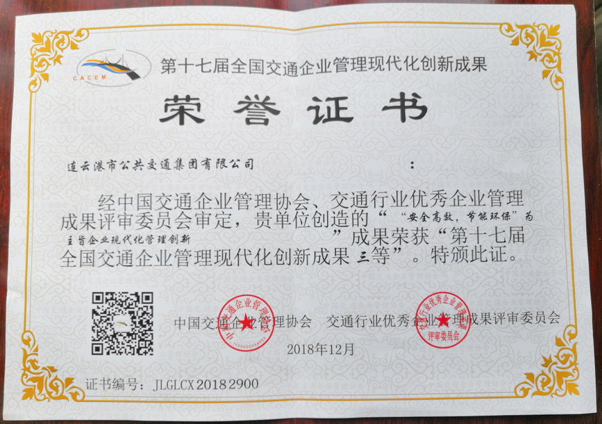 公交集團(tuán)喜獲第十七屆全國交通企業(yè)管理現(xiàn)代化創(chuàng)新成果三等獎