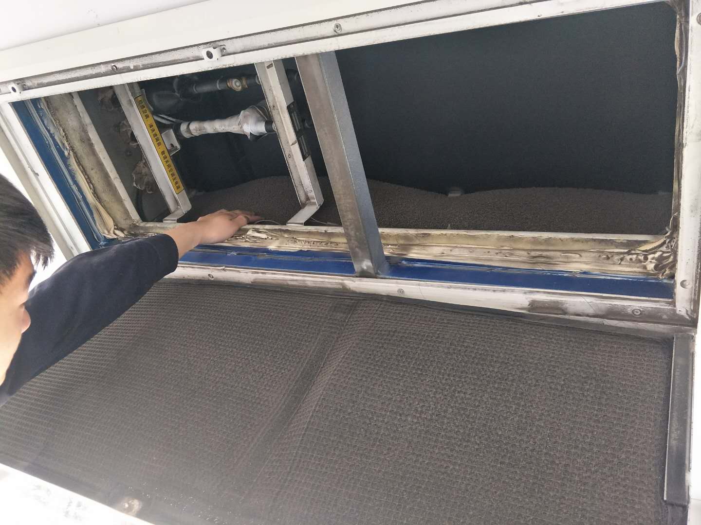 2.使用手電筒在回風(fēng)柵處查看蒸發(fā)器芯體側(cè)擋塵網(wǎng),用手按壓擋塵網(wǎng),按壓后如果手上沉淀一層浮灰,需清潔請將擋塵網(wǎng)拆下用水清洗。(純電動車通用)