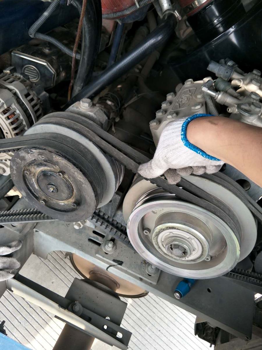 4.用手按壓壓縮機至發(fā)動機皮帶中間位置,8-10mm為正常,按壓超過10mm需要調(diào)整張緊度。(傳統(tǒng)燃油氣車輛)