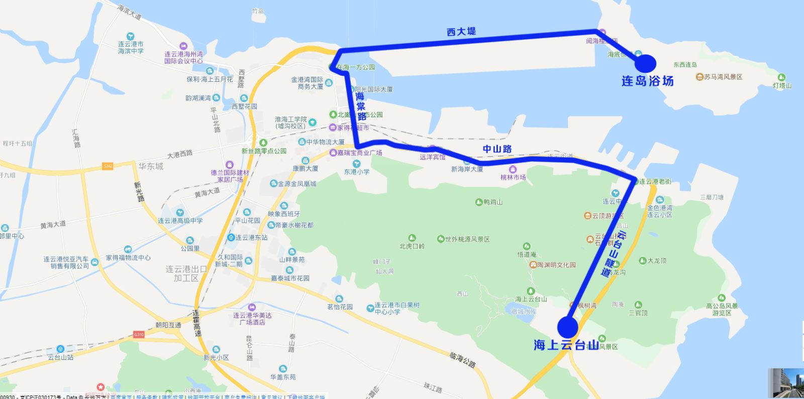 1、線路走向:海上云臺(tái)山—云臺(tái)山隧道—中山東路—海濱大道—西大堤—連島北路—連島浴場(chǎng)