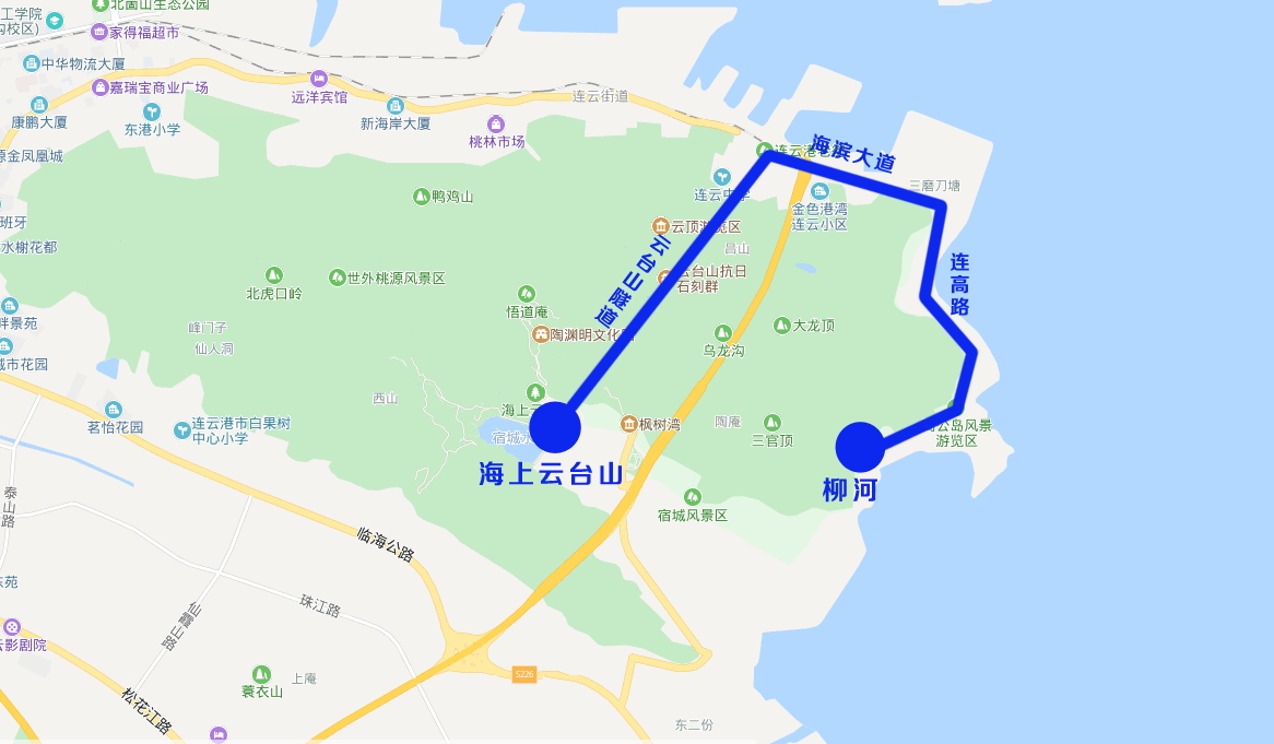 2、途經(jīng)站點(diǎn):海上云臺(tái)山、隧道北、連云古鎮(zhèn)、旗臺(tái)嘴、黃窩小區(qū)、黃窩、高公島、大壩角、柳河