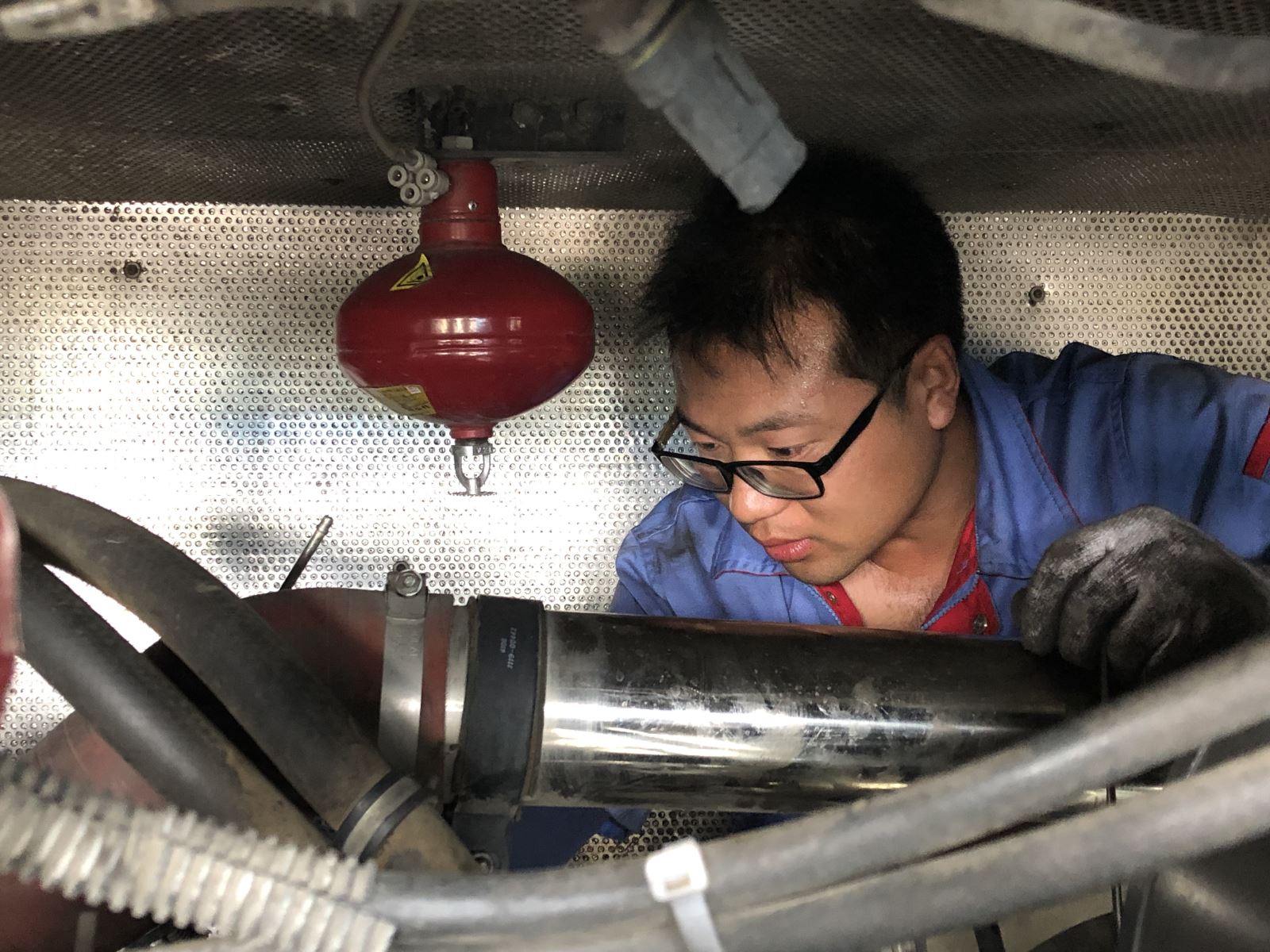不存在午休不午休,只要有故障的車子送到這里來維修,維修工們就會精心檢查。夏季,這個時候的太陽最為毒辣,但這并沒有使維修工們退卻,濕透的衣服、滴落的汗水述說著他們的全力以赴。