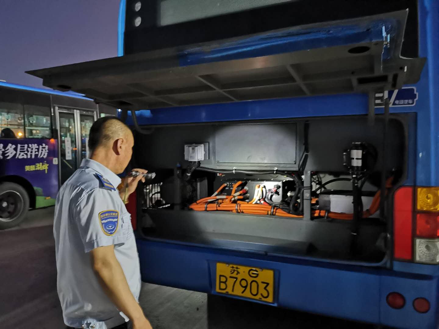 深夜,值班的公交人沒有絲毫倦意,巡視場站,一輛輛檢查停放在場站里的公交車是否關(guān)好電源、門窗,拔出鑰匙,檢查輪胎、發(fā)動機,用滿身的汗水和滿手的油漬,胳膊、腿上被蚊子“親吻”過的痕跡總是讓他們的嚴肅的臉上多了幾分可愛,也是因為如此,才保障了新的一天每輛公交車正常運行。