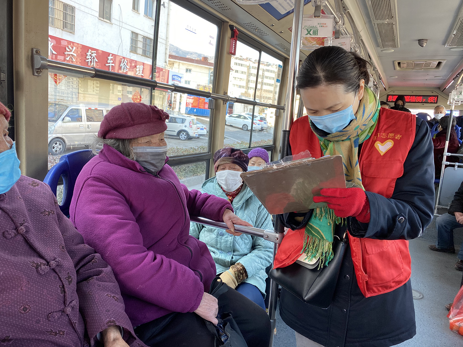 東部城區(qū)公交31路自園丁小區(qū)發(fā)車,終點(diǎn)站連云古鎮(zhèn),每天的乘客老年人占大多數(shù)。為更好地宣傳疫情防護(hù)工作,3月5日公交事業(yè)二部13名志愿者分兩人一組,到公交31路車廂內(nèi)開展志愿服務(wù)活動。引導(dǎo)乘客申請“連易通”二維碼,并正確使用。但是31路公交車上老年人居多,最多的一趟班次中,共35人乘車,其中有33位是老年人,有一些年齡大的老人,連自己的電話都記不得。志愿者們提前做好功課,了解31路乘車群體特征,準(zhǔn)備了登記簿,詳細(xì)、耐心地為這些不能出示“連易通”二維碼的老年乘客進(jìn)行姓名、社區(qū)、聯(lián)系方式登記,還勸說老年乘客非必要盡量減少外出,無法出示的“連易通”綠色二維碼請家人幫忙申請并打印后隨身攜帶。