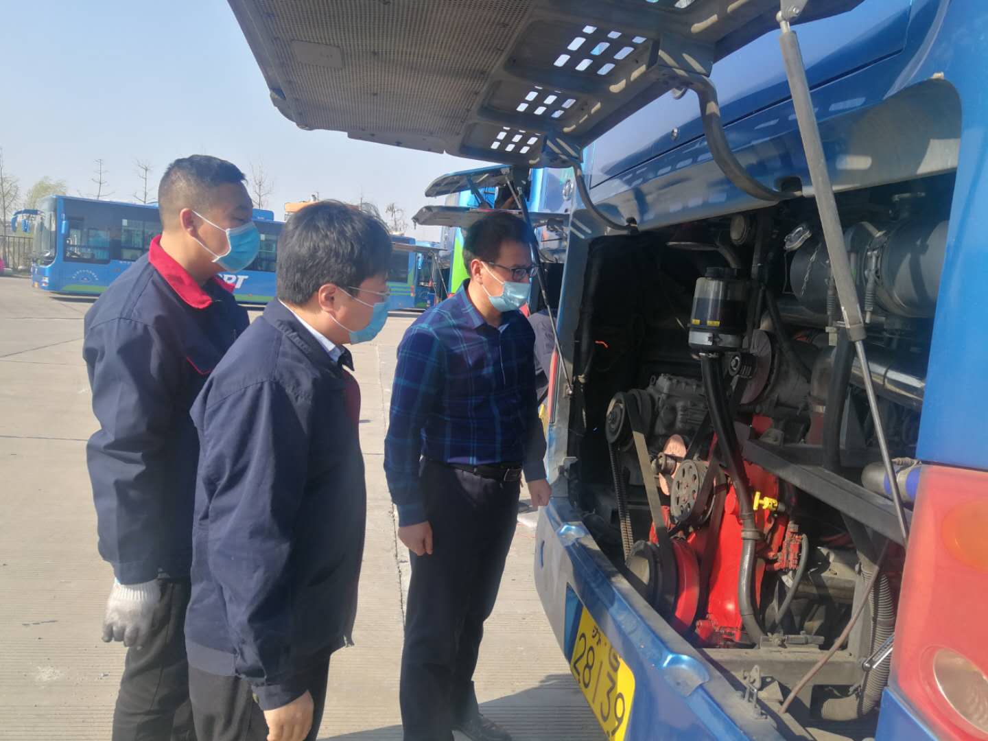 領(lǐng)導(dǎo)班子成員仔細查看了場站內(nèi)18米車的車況,重點檢查了車輛發(fā)動機艙、剎車及打氣泵等位置,對18米車的修舊利廢、修理工作進行了現(xiàn)場指導(dǎo)。周總對加氣站所在區(qū)域的安全距離提出具體部署:加氣站周圍50米內(nèi)要保持安全距離,禁止停放任何車輛,場站內(nèi)私家車及運營車輛必須規(guī)范停放。
