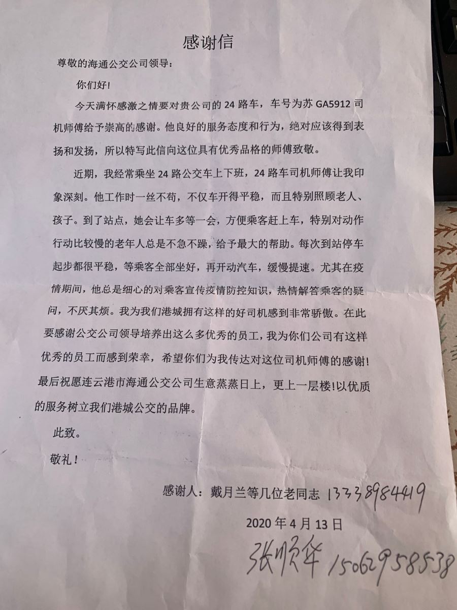 信中,戴女士表示她經(jīng)常乘坐24路公交車上下班,徐剛師傅讓她印象十分深刻,他不僅車開的平穩(wěn),而且對待老人、孩童的態(tài)度也非常和藹。每當(dāng)看見行動較慢的老人往站點(diǎn)趕時(shí),徐師傅總是不急不躁,耐心等候,攙扶老人上車,直到老人坐穩(wěn)才駕車駛離站點(diǎn);每當(dāng)遇到放學(xué)的學(xué)生乘車時(shí),他總是提醒車內(nèi)乘客給孩子讓個(gè)座。疫情期間,徐師傅細(xì)心的為乘客宣傳疫情防控知識,熱心解答乘客的疑問,不厭其煩。戴女士為港城能擁有這樣的好駕駛員感到驕傲。