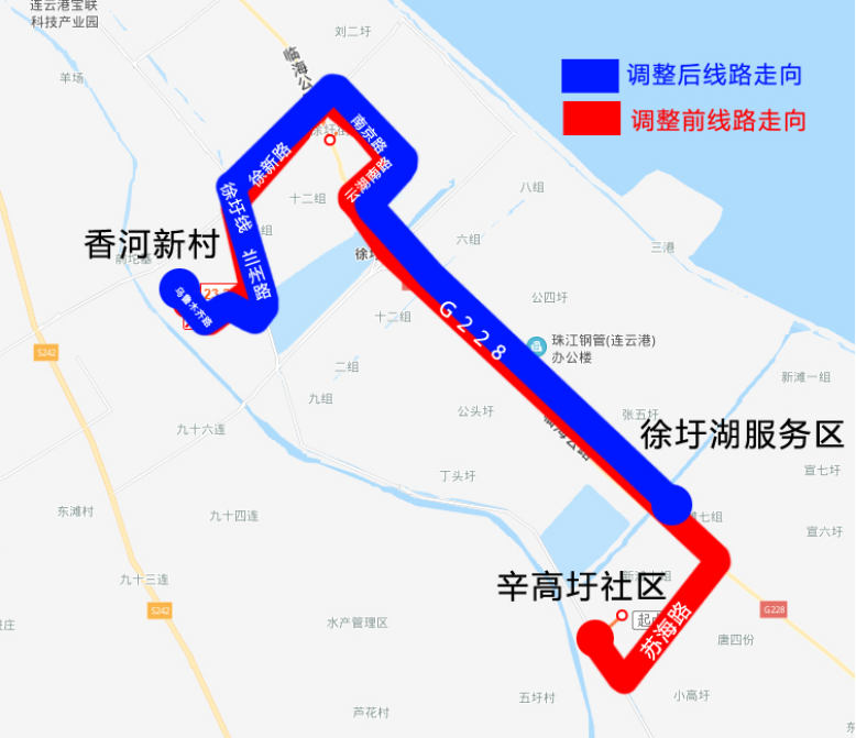 線路走向:徐圩湖服務(wù)區(qū)-G228-云湖南路-南京路-徐新路-徐圩線-蘭州路-燈塔路-銀川路-徐圩大道-烏魯木齊路-香河新村